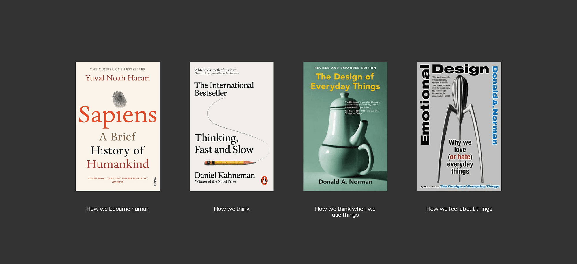 That’s why it’s more crucial than ever to learn more about and understand how both people and machines work and think. Books like Sapiens, Thinking, Fast and Slow, The Design of Everyday Things, and Emotional Design provide a solid foundation for understanding these topics.